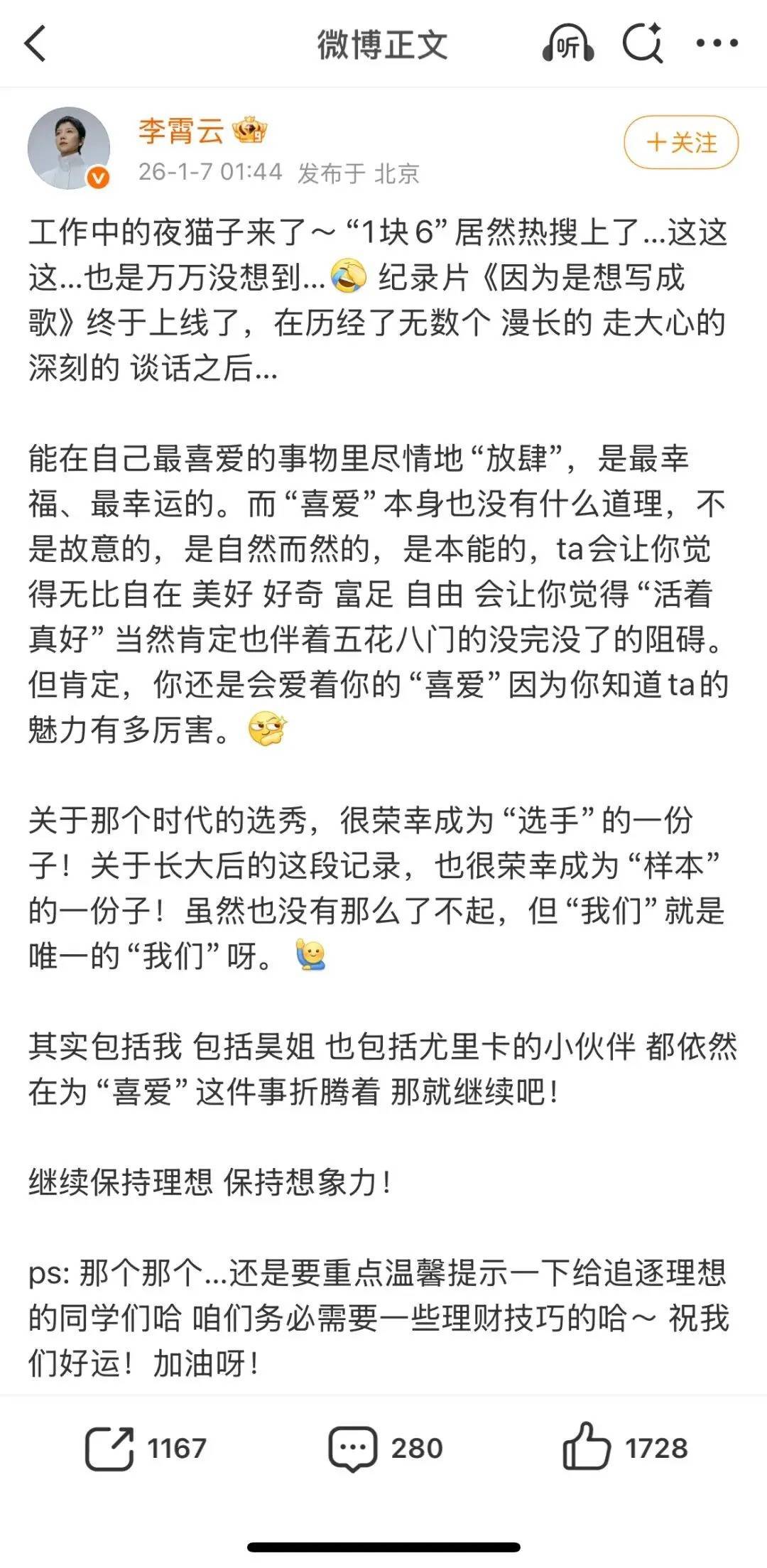 1月7日,她发文回应称,能在自己最喜爱的事物里尽情地“放肆”,是最幸福、最幸运的。而“喜爱”本身也没有什么道理,不是故意的,是自然而然的,是本能的,ta会让你觉得无比自在 美好 好奇 富足 自由 会让你觉得“活着真好” 当然肯定也伴着五花八门的没完没了的阻碍。但肯定,你还是会爱着你的“喜爱”因为你知道ta的魅力有多厉害。